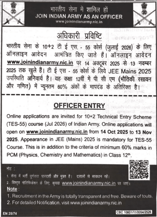 The Join Indian Army released the Indian Army 10+2 Technical Entry Scheme (TES) 55th Course July 2026 notification on 7 October 2025, announcing 90 vacancies for Lieutenant posts. This is a prime opportunity for candidates seeking Sarkari jobs in 2025 across All India on a permanent basis with a salary of ₹56,100. Applications are open from 14 October 2025 to 13 November 2025 (11:59 PM) via joinindianarmy.nic.in. There are no application fees for any category. Eligible candidates need 12th with PCM (60% marks), appeared JEE (Mains) 2025, and must be unmarried males, aged 16.5–19.5 years as on 01/07/2026 (born between 02/01/2007 and 01/01/2010). The selection process includes Shortlisting, SSB Interview, Document Verification, and Medical Examination. This guide covers the Indian Army TES 55th Entry Online Form 2025, eligibility, selection process, and key details for the Indian Army TES 2025.