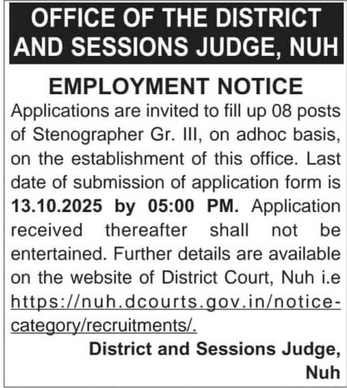 The District and Sessions Judge, Nuh (Haryana) released the Nuh Court Stenographer Recruitment 2025 notification on 2 October 2025, announcing 8 vacancies for Stenographer Grade-III posts on an adhoc basis. This is a prime opportunity for candidates seeking Sarkari jobs in 2025 in Nuh, Haryana with a salary of ₹25,500. Applications are accepted offline from 2 October 2025 (tentative) to 13 October 2025 (5:00 PM) by sending forms to Office of the District and Sessions Judge, Judicial Court Complex, Nuh (Mewat), Haryana-122107. There are no application fees for any category. Eligible candidates need a Graduate degree, English Shorthand (80 wpm), Transcription (20 wpm on Computer), and Computer Knowledge, aged 18–42 years as on 01/07/2025 (relaxations apply). The selection process includes a Shorthand Test, Computer Proficiency Test, Document Verification, and Medical Examination. This guide covers the Nuh Court Stenographer Offline Form 2025, eligibility, selection process, and key details for the Nuh Court Recruitment 2025.